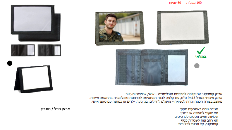 • סובלימציה: מתאימה רק אם מדובר בארנק פוליאסטר בצבע בהיר (פחות נפוץ אצל חיילים, אך אפשרי על ארנקי "חאקי").