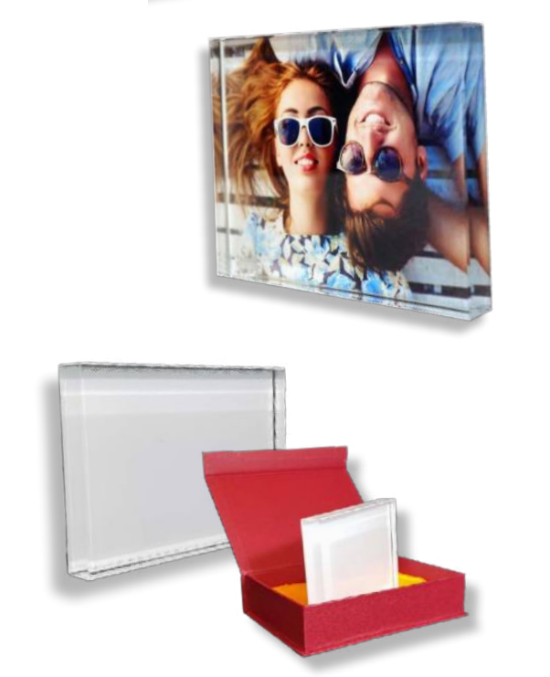 ההדפסה נעשית על גב הבלוק/מעמד (על הציפוי), והתמונה נראית דרך עובי הזכוכית, מה שמקנה עומק ואיכות מיוחדת.