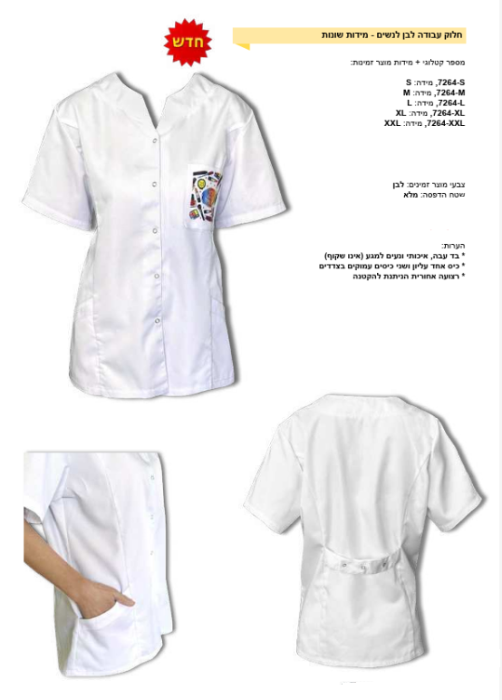 - מיקום המיתוג: לוגו קטן על כיס החזה, או שם העובדת מעל הכיס.